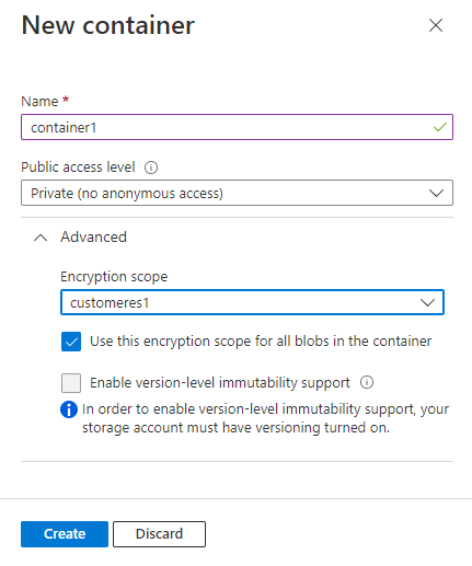 4. To require that all blobs in the container use the default encryption scope, select the checkbox to Use this encryption scope for all blobs in the container. If this checkbox is selected, then an individual blob in the container cannot override the default encryption scope.