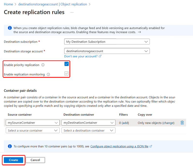 In the Create replication rules pane, select your chosen Destination subscription and Destination storage account. Select the Enable priority replication checkbox as shown.
