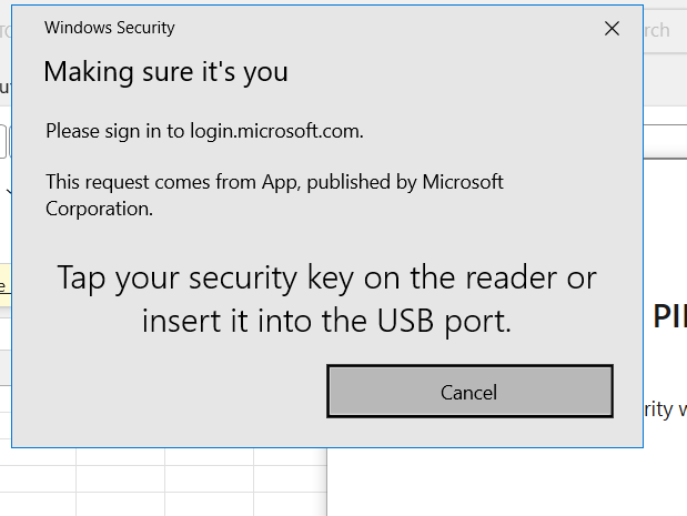 The prompt to “tap your security key on the reader or insert it into the USB port” indicates that Excel is trying to sign in using a strong authentication method (a hardware security key) that is associated with the account being used. When this method is required or preferred on the account, Office apps can start requesting it even if they did not do so previously.