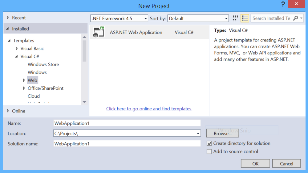 First, we'll create a new ASP.NET Web Application project. In Visual Studio, from the File menu, select New > Project. Under Templates, Web, select ASP.NET Web Application.