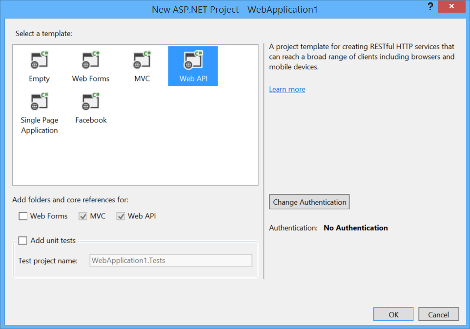 Choose the Web API project template.
