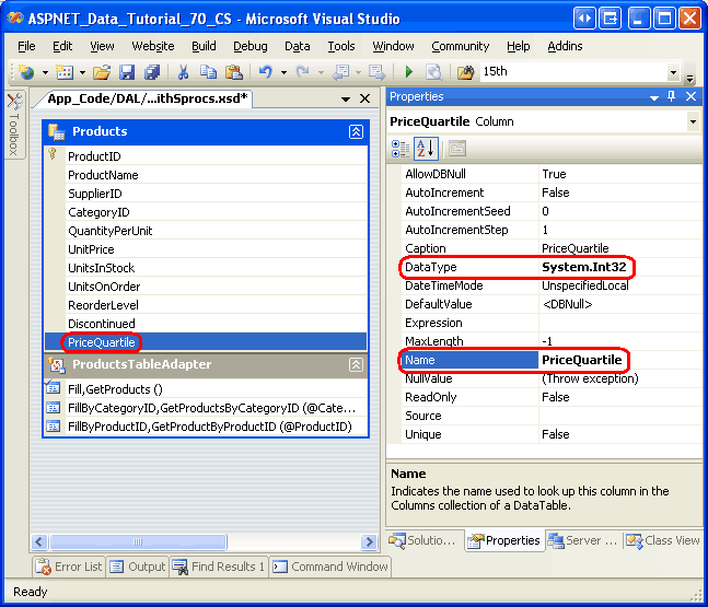 This will add a new column to the DataTable named Column1 of type System.String. We need to update this column s name to PriceQuartile and its type to System.Int32 since it will be used to hold a number between 1 and 4. Select the newly-added column in the ProductsDataTable and, from the Properties window, set the Name property to PriceQuartile and the DataType property to System.Int32.