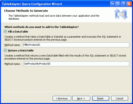 Finally, change the generated method names to FillByProductID and GetProductByProductID.