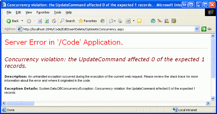 Figure 17: When a Concurrency Violation is Detected, a DBConcurrencyException is Thrown (Click to view full-size image)