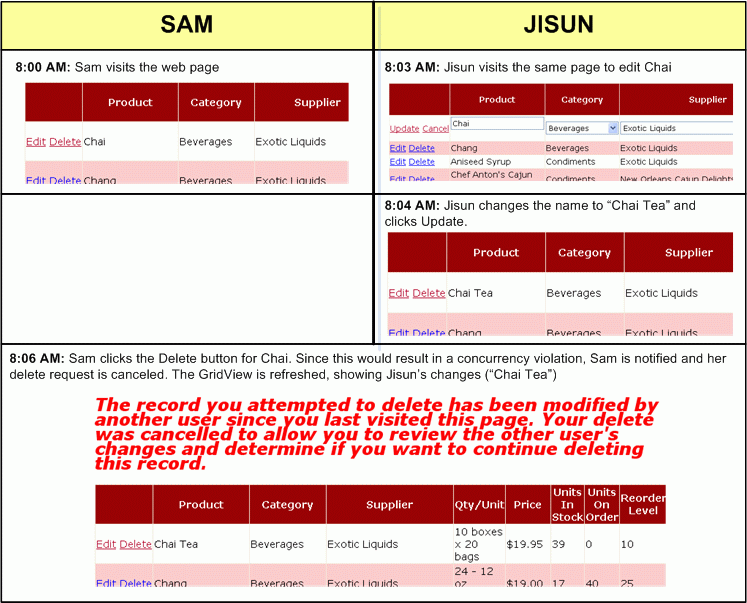 For example, imagine that two users, Jisun and Sam, were both visiting a page in our application that allowed visitors to update and delete the products through a GridView control. Both click the Edit button in the GridView around the same time. Jisun changes the product name to "Chai Tea" and clicks the Update button. The net result is an UPDATE statement that is sent to the database, which sets all of the product's updateable fields (even though Jisun only updated one field, ProductName). At this point in time, the database has the values "Chai Tea," the category Beverages, the supplier Exotic Liquids, and so on for this particular product. However, the GridView on Sam's screen still shows the product name in the editable GridView row as "Chai". A few seconds after Jisun's changes have been committed, Sam updates the category to Condiments and clicks Update. This results in an UPDATE statement sent to the database that sets the product name to "Chai," the CategoryID to the corresponding Beverages category ID, and so on. Jisun's changes to the product name have been overwritten. Figure 1 graphically depicts this series of events.