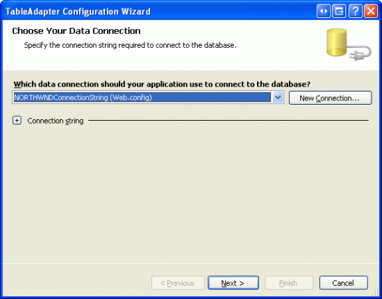 To create a new Typed DataSet, right-click on the DAL folder within the App_Code folder and add a new DataSet named NorthwindOptimisticConcurrency. As we saw in the first tutorial, doing so will add a new TableAdapter to the Typed DataSet, automatically launching the TableAdapter Configuration Wizard. In the first screen, we're prompted to specify the database to connect to - connect to the same Northwind database using the NORTHWNDConnectionString setting from Web.config.
