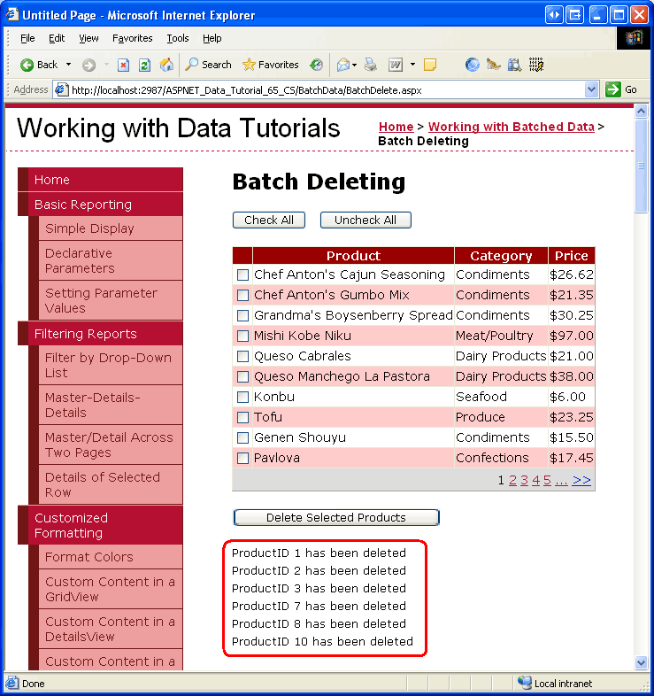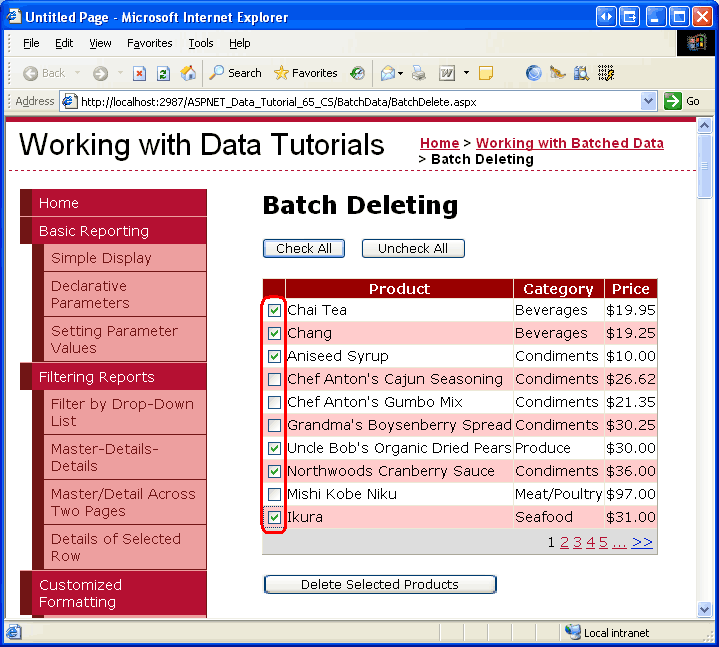 After copying over the declarative markup and source code, take a moment to test BatchDelete.aspx by viewing it through a browser. You should see a GridView listing the first ten products in a GridView with each row listing the product s name, category, and price along with a checkbox. There should be three buttons: Check All, Uncheck All, and Delete Selected Products. Clicking the Check All button selects all checkboxes, while Uncheck All clears all checkboxes. Clicking Delete Selected Products displays a message that lists the ProductID values of the selected products, but does not actually delete the products.