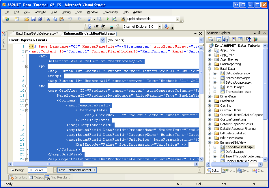 Since we already created the batch deleting interface in the Adding a GridView Column of Checkboxes tutorial, we can simply copy it to BatchDelete.aspx rather than creating it from scratch. Start by opening the BatchDelete.aspx page in the BatchData folder and the CheckBoxField.aspx page in the EnhancedGridView folder. From the CheckBoxField.aspx page, go to the Source view and copy the markup between the <asp:Content> tags as shown in Figure 2.
