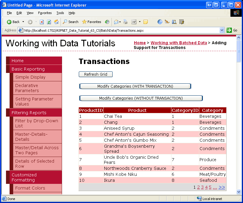 To demonstrate this behavior, visit this page through a browser. Initially you should see the first page of data as shown in Figure 8. Next, click the Modify Categories (WITH TRANSACTION) button. This will cause a postback and attempt to update all of the products CategoryID values, but will result in a foreign key constraint violation (see Figure 9).