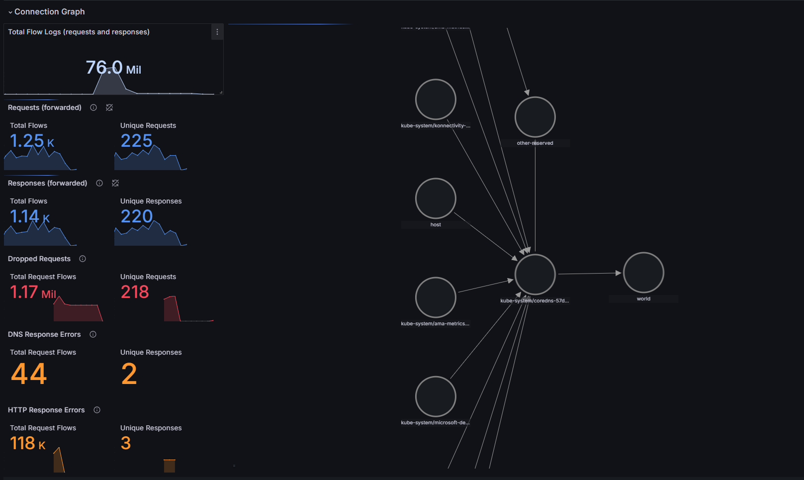 Go to Azure > Insights > Containers > Networking > Flow Logs. This dashboard shows which AKS workloads are communicating with each other, including network requests, responses, drops, and errors. Currently, as an interim step during preview, you must import Grafana dashboards by using a user ID to view the flow logs dashboard in the Azure portal.