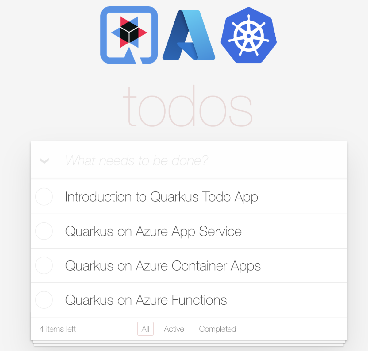 export QUARKUS_URL=http://$(kubectl get svc -n ${AKS_NS} | grep quarkus-todo-demo-app-aks | cut -d " " -f10)