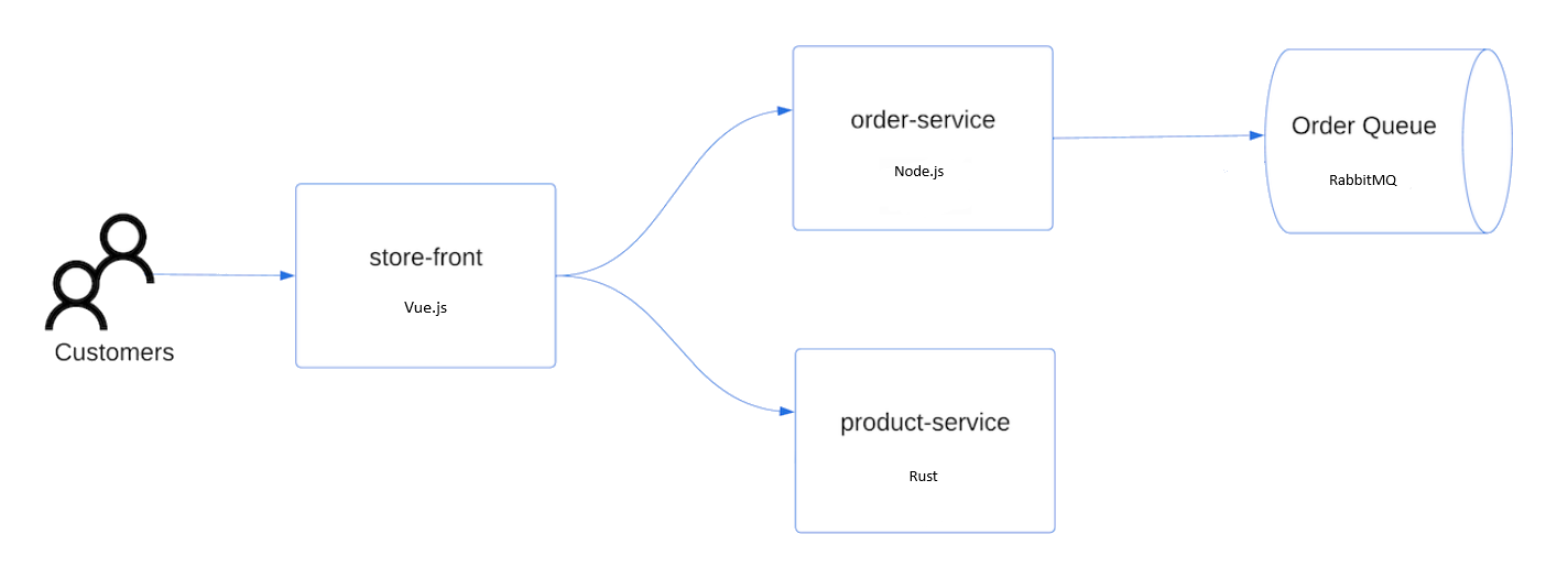 The sample application used in this tutorial is a basic store front app including the following Kubernetes deployments and services: