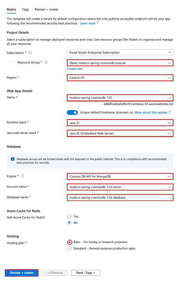 3. Name: msdocs-spring-cosmosdb-XYZ where XYZ is any three random characters. This name must be unique across Azure.