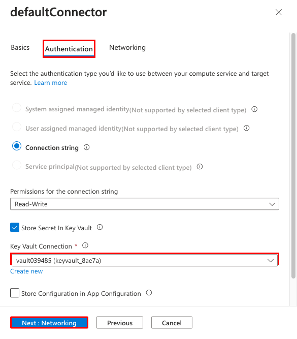 The creation wizard generated the connectivity string for you already as an app setting. However, the security best practice is to keep secrets out of App Service completely. You'll move your secrets to a key vault and change your app setting to a Key Vault reference with the help of Service Connectors.