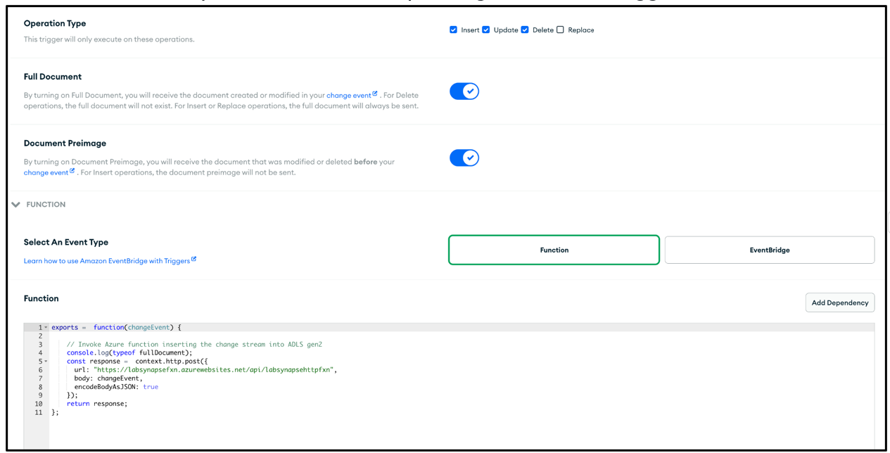 The Atlas function code triggers the Azure function that's associated with the Azure function endpoint by passing the entire changeEvent in the body of the request to the Azure function.