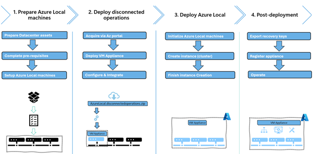 You deploy and configure Azure Local with disconnected operations in multiple steps. The following image shows the overall journey, including post-deployment.