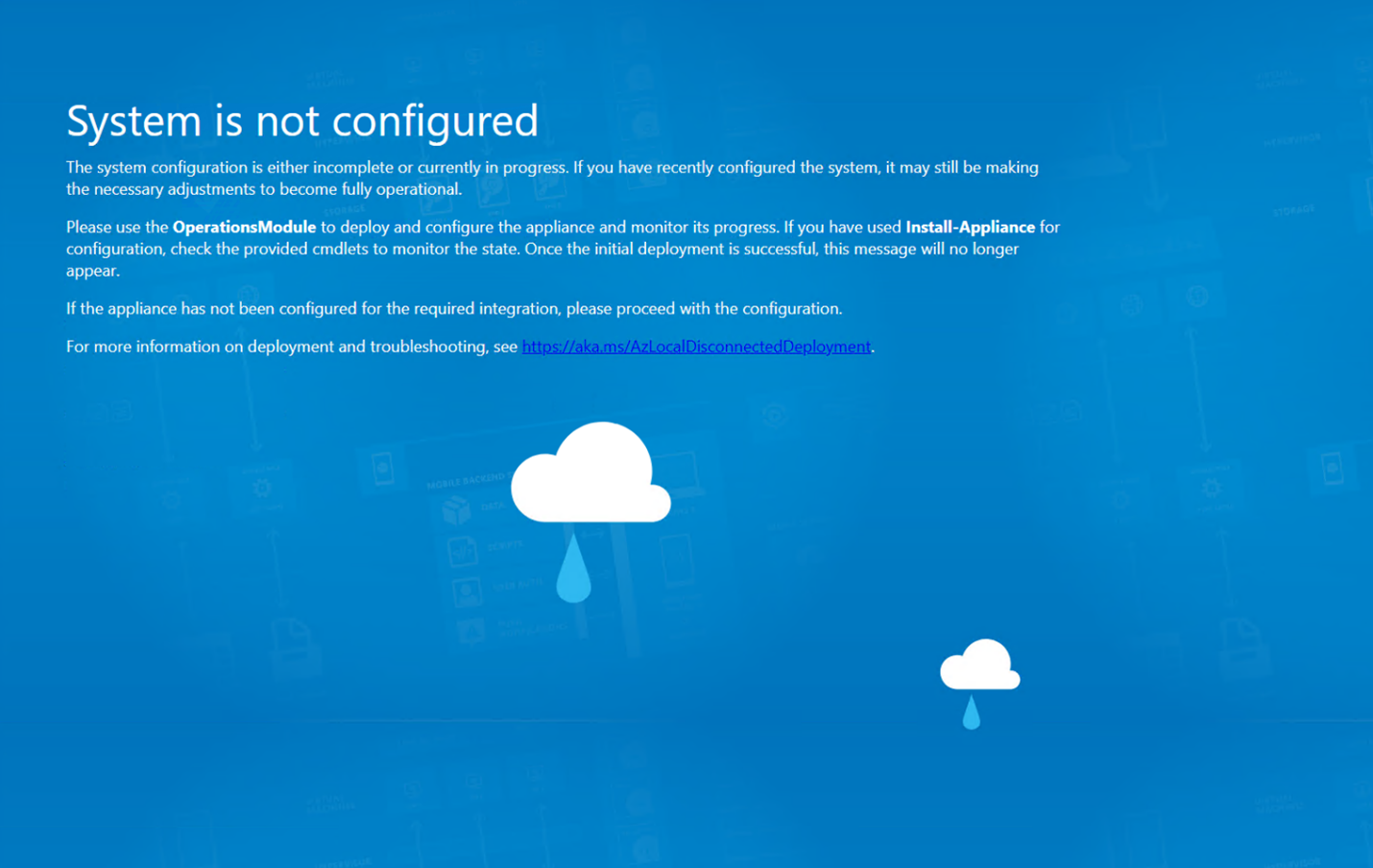 After you install the appliance, you might see this screen for a while. Let the configuration run for 2 to 3 hours. After you wait the 2 to 3 hours, the screen goes away, and you see the regular Azure portal. If the screen doesn't go away and you can't access the local Azure portal, troubleshoot the issue.
