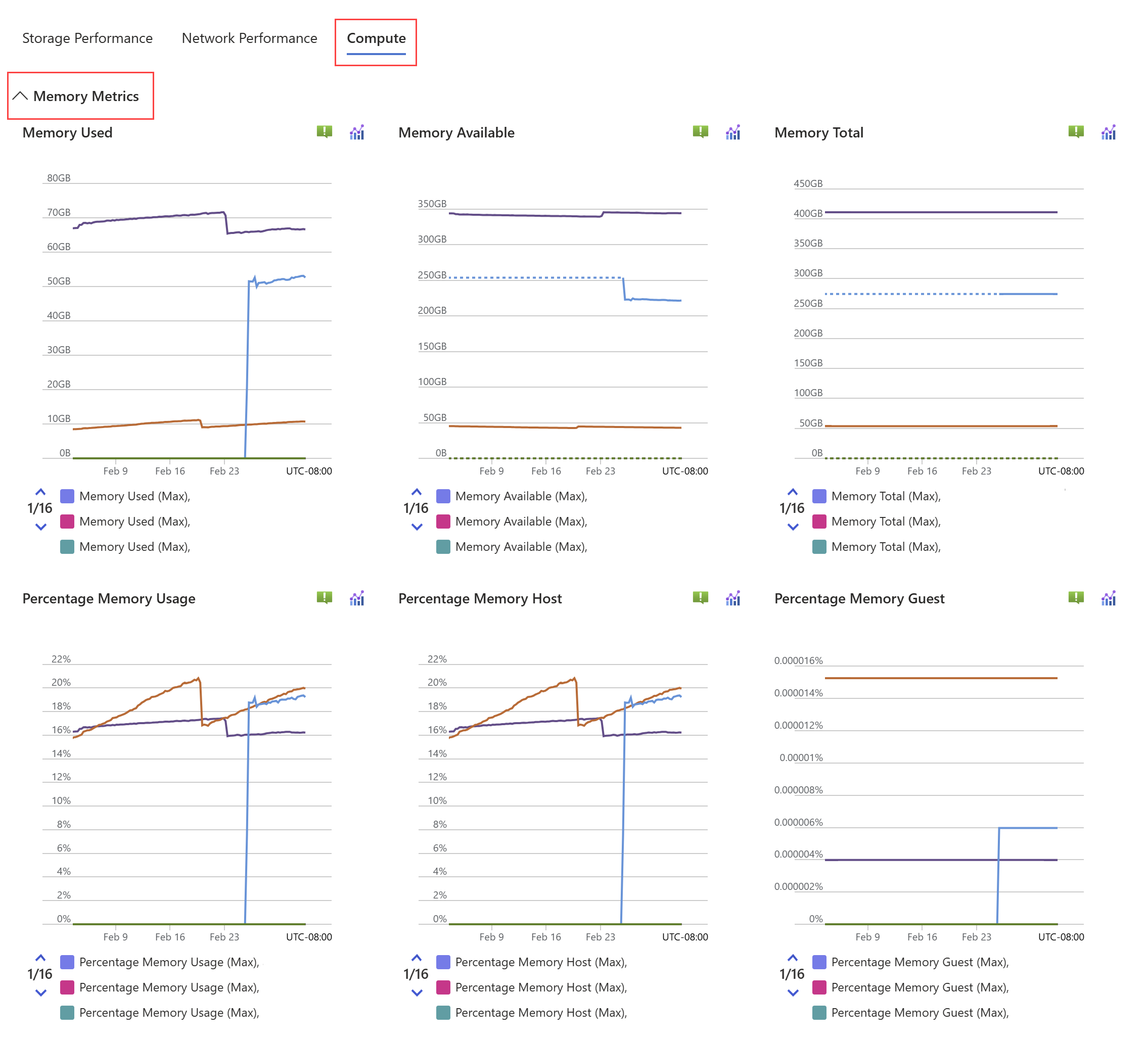 | VM Memory Pressure | The ratio of memory demanded by the virtual machine over memory allocated to the virtual machine. | Bytes | Maximum | Minimum, Maximum, Average | Cluster, Node, LUN, VM |