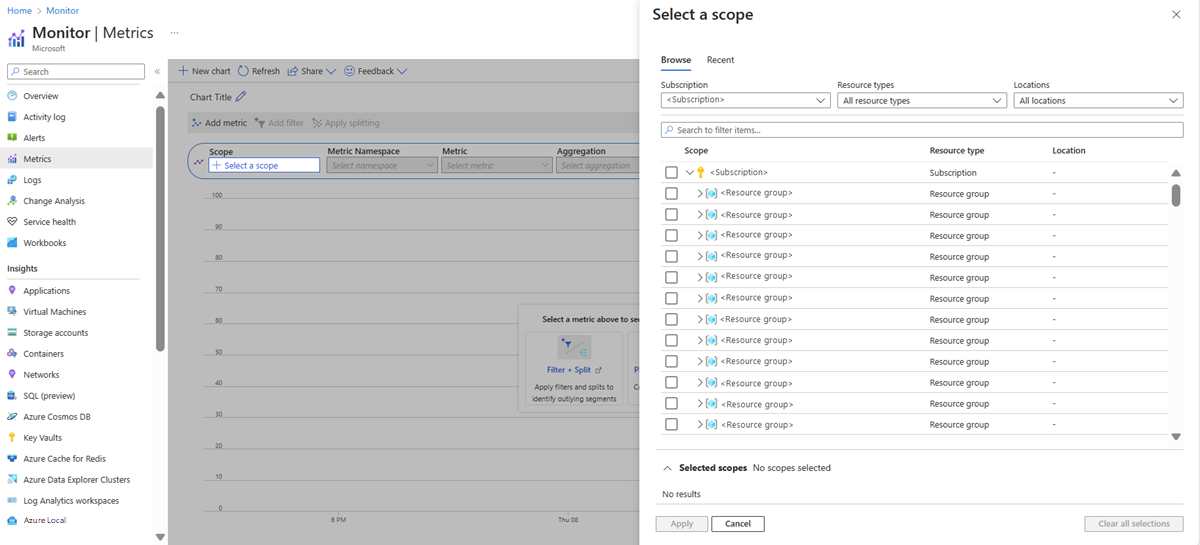 To analyze metrics, select the Metrics option. Your cluster will already be populated in the scope section. Select the metric you want to analyze.
