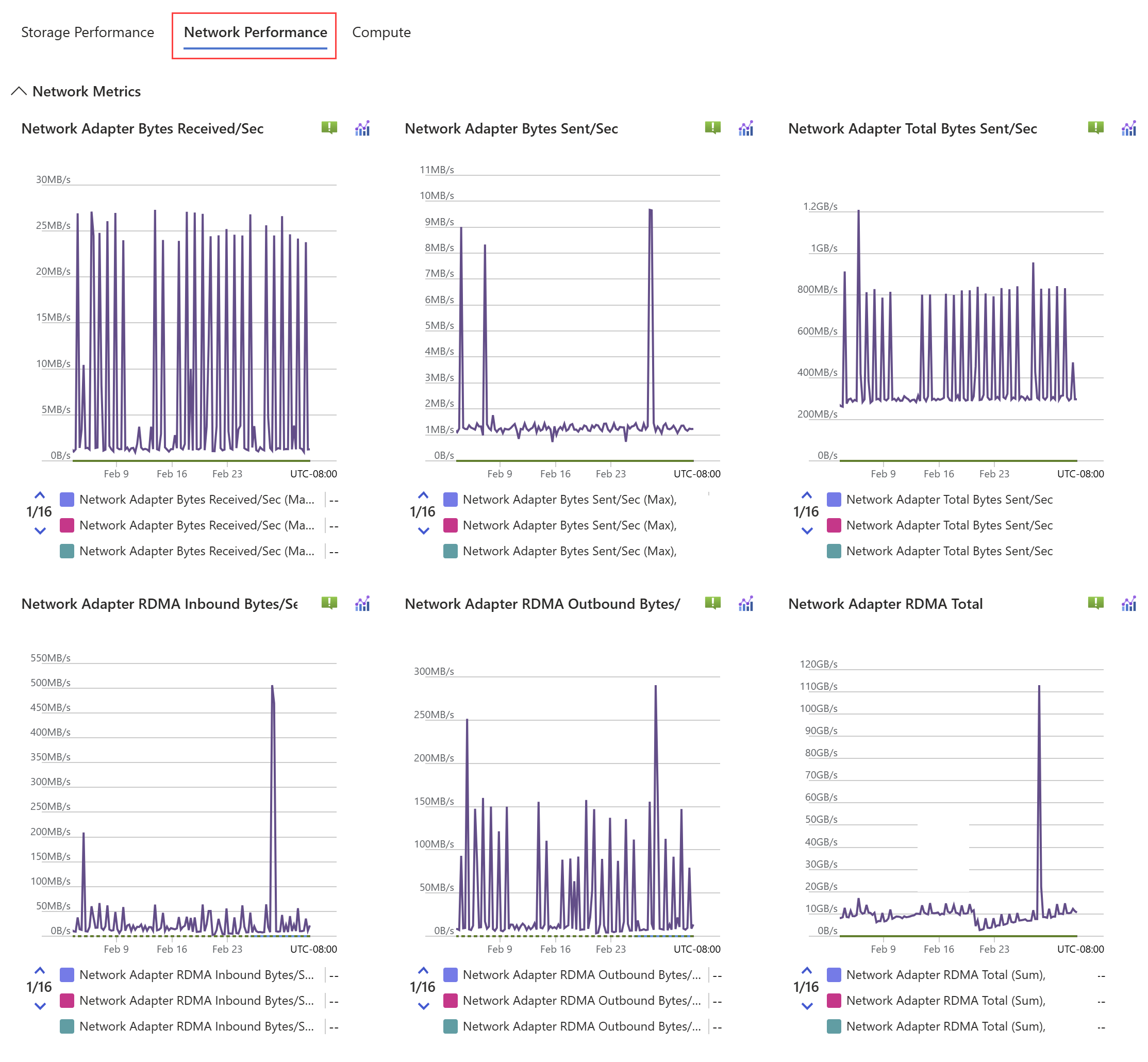 | Netadapter Bandwidth Rdma Total | Total rate of data received or sent over RDMA by the network adapter. | Bytes Per Second | Sum | Minimum, Maximum, Sum, Count | Cluster, Node, Network Adapter, LUN |