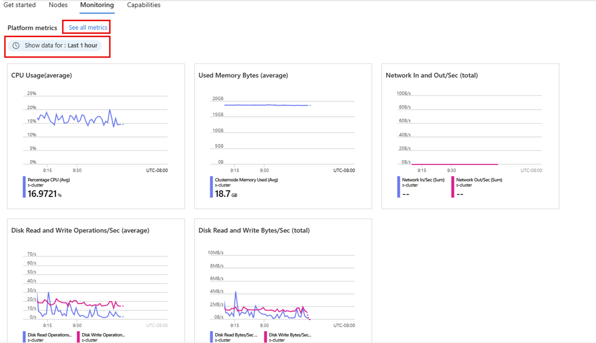 In the Azure portal, you can monitor platform metrics of your cluster by navigating to the Monitoring tab on your cluster's Overview page. This tab offers a quick way to view graphs for different platform metrics. You can select any of the graphs to further analyze the data in metrics explorer.