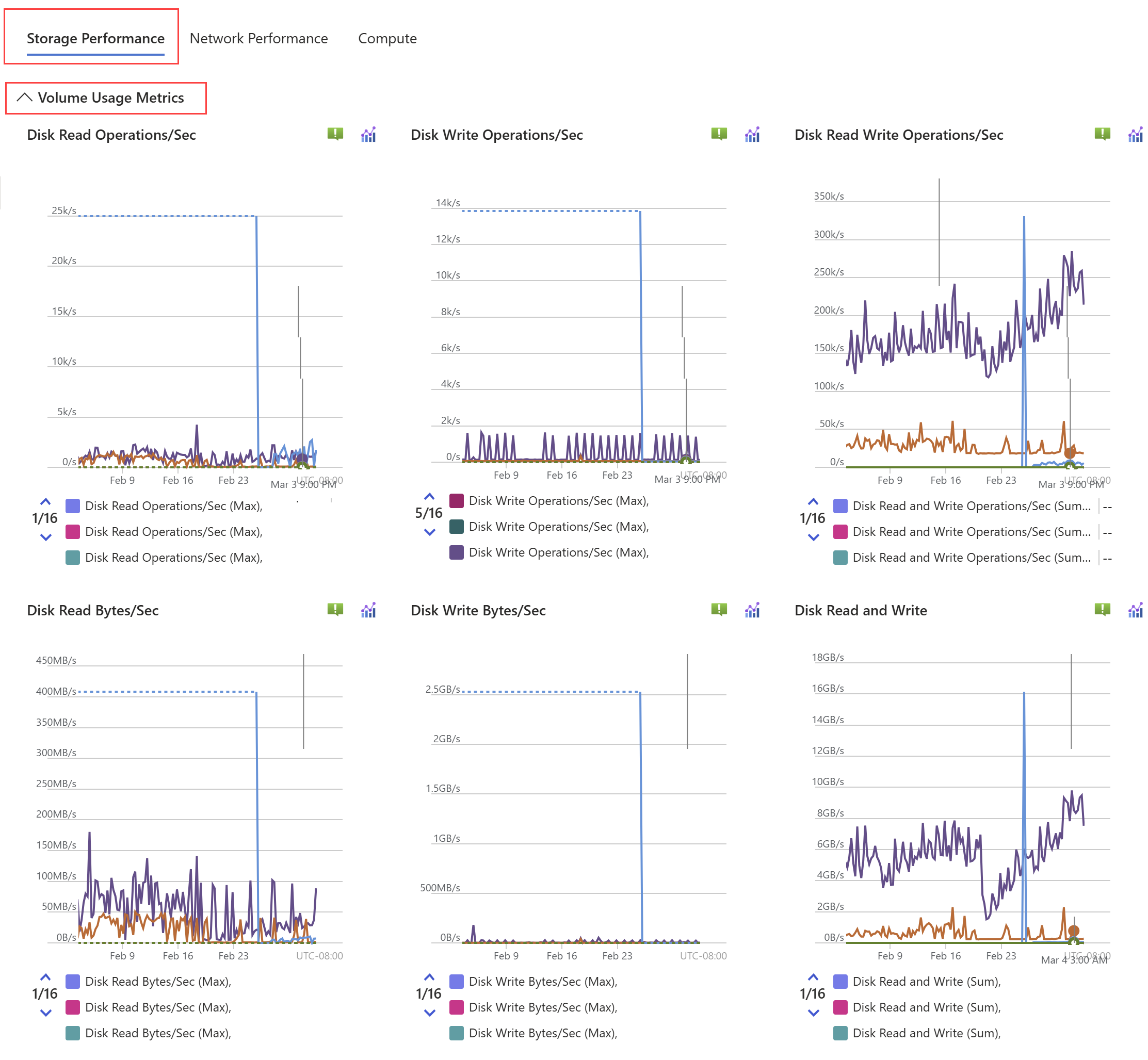Volume Usage Metrics. This section displays metrics related to volume usage, such as disk read/write operations per second, disk read/write bytes per second, and volume latency.