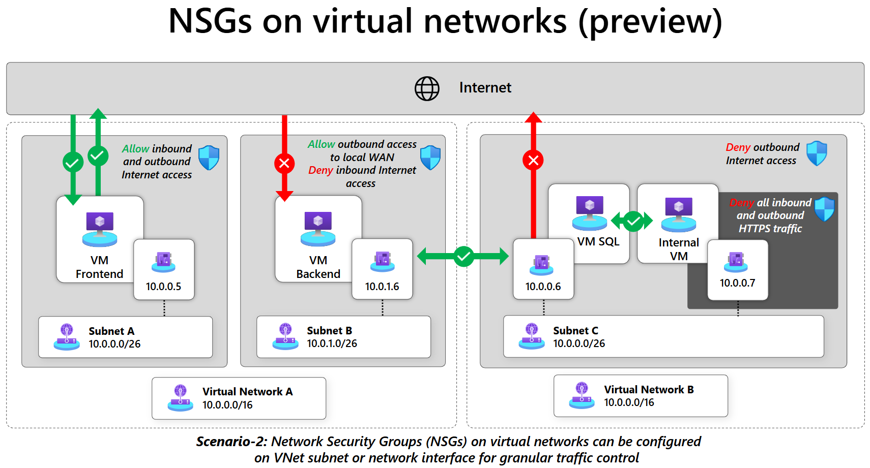 The diagram highlights how different parts of an application can have public-facing Internet access, limited enterprise WAN-only access, and fully isolated, internal-only access. Granular traffic controls can be implemented with NSGs associated with either the virtual network subnets or the network interfaces.