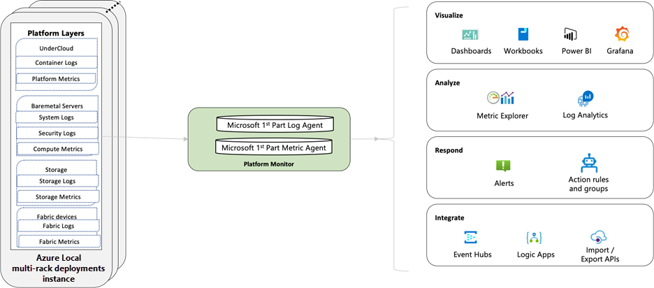 Azure Local provides monitoring capabilities fully integrated with Azure Monitor. These capabilities provide insights, help visualize and analyze data, and empower you to respond to incoming monitoring data. The following sections provide an overview of what capabilities are available and the benefits they provide.