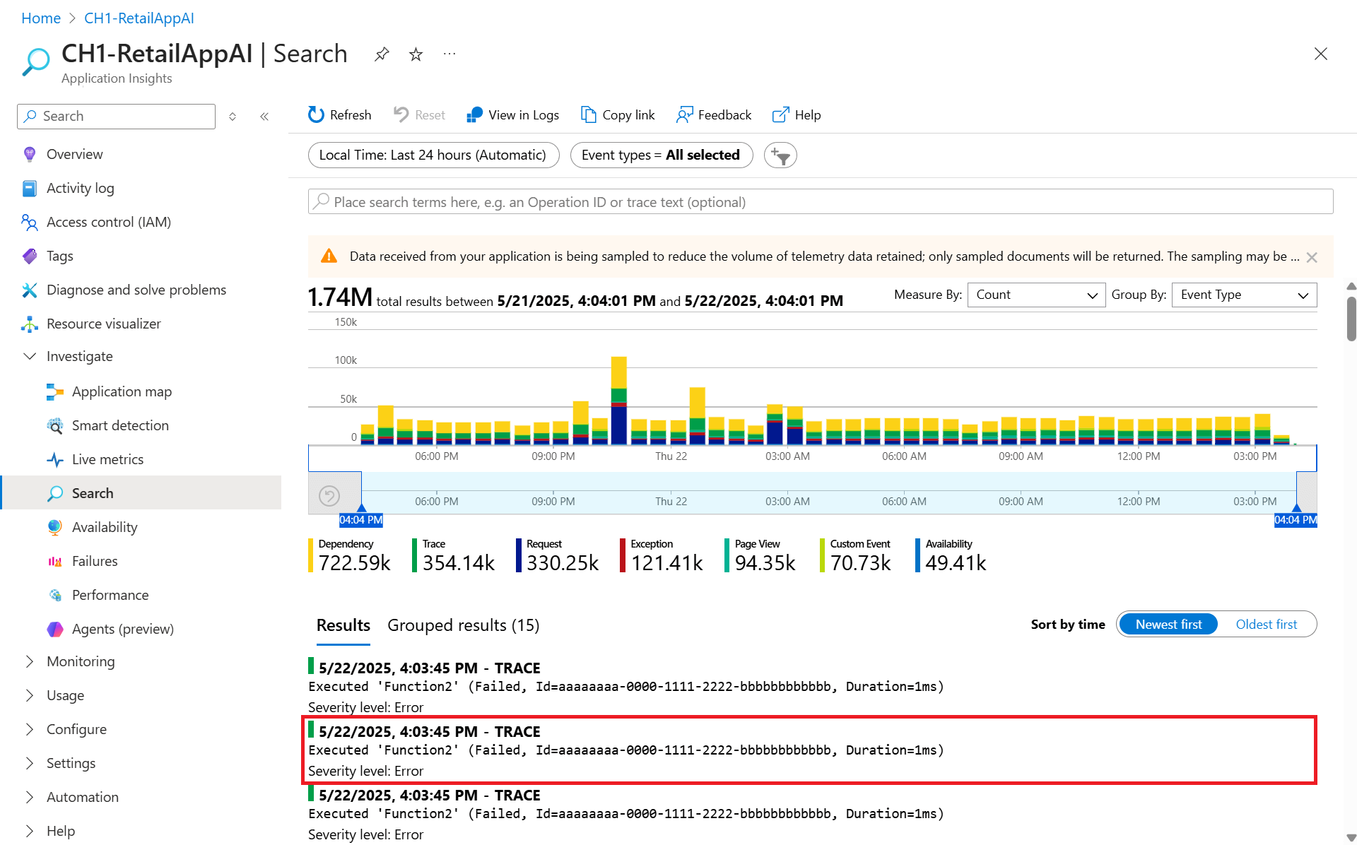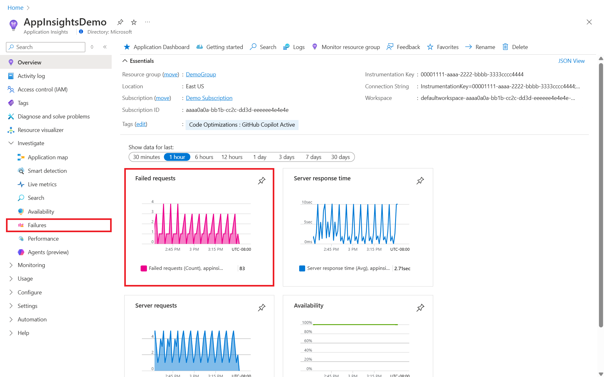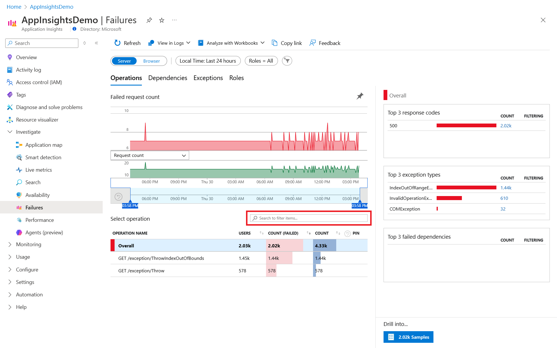 To get to the Failures view in Application Insights, select either the Failed requests graph on the Overview pane, or Failures under the Investigate category in the resource menu.