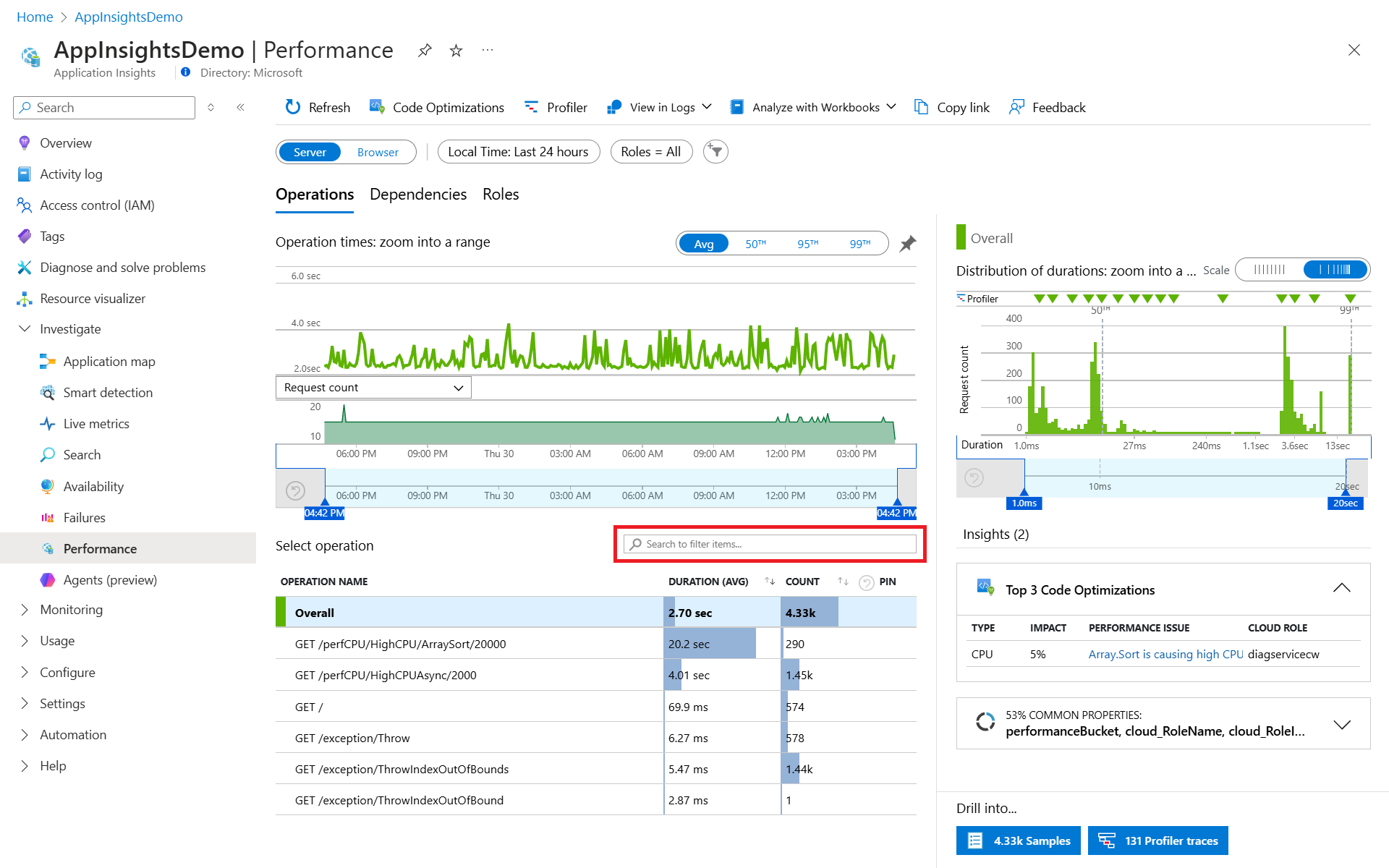 Select an operation to view the Top 3 response codes, Top 3 exception types, and Top 3 failed dependencies for that operation.