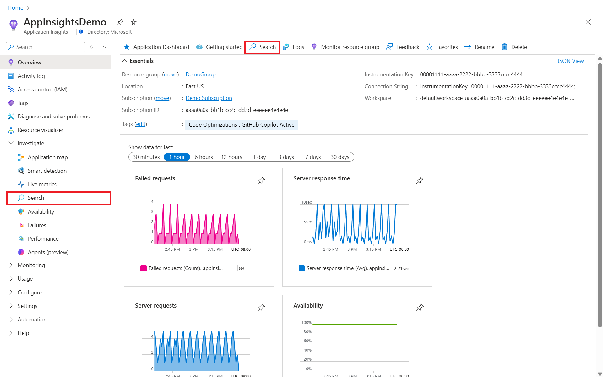 - The target resource links to Application Insights through the