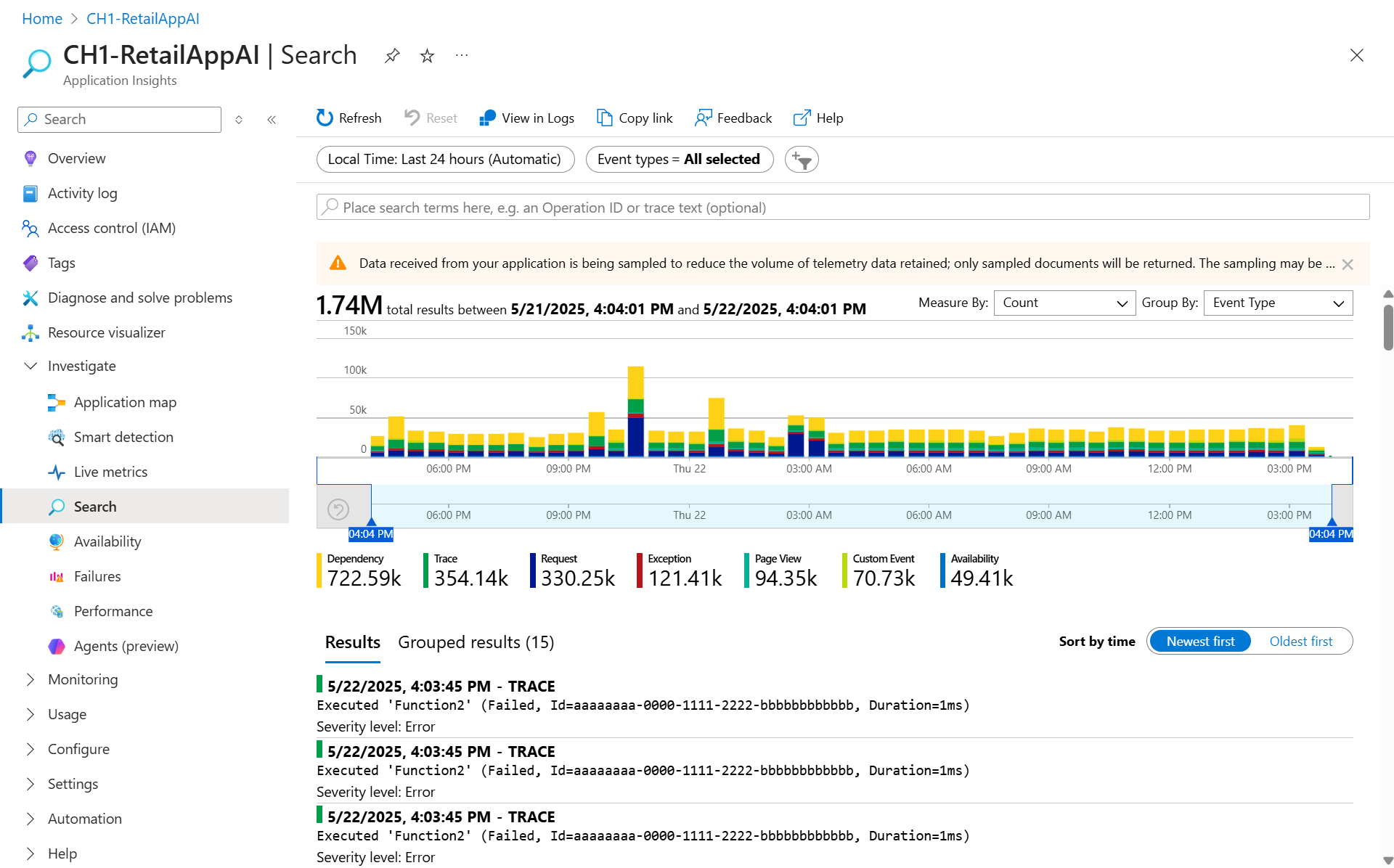 Search view - Enables users to locate and examine individual telemetry items such as page views, exceptions, and custom events.
