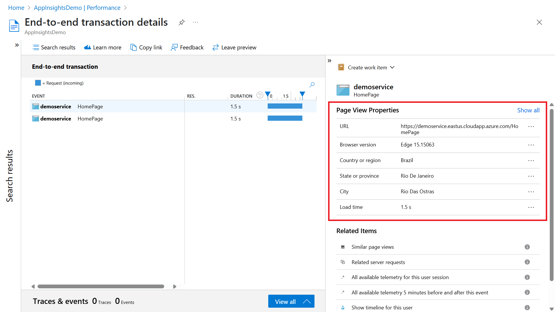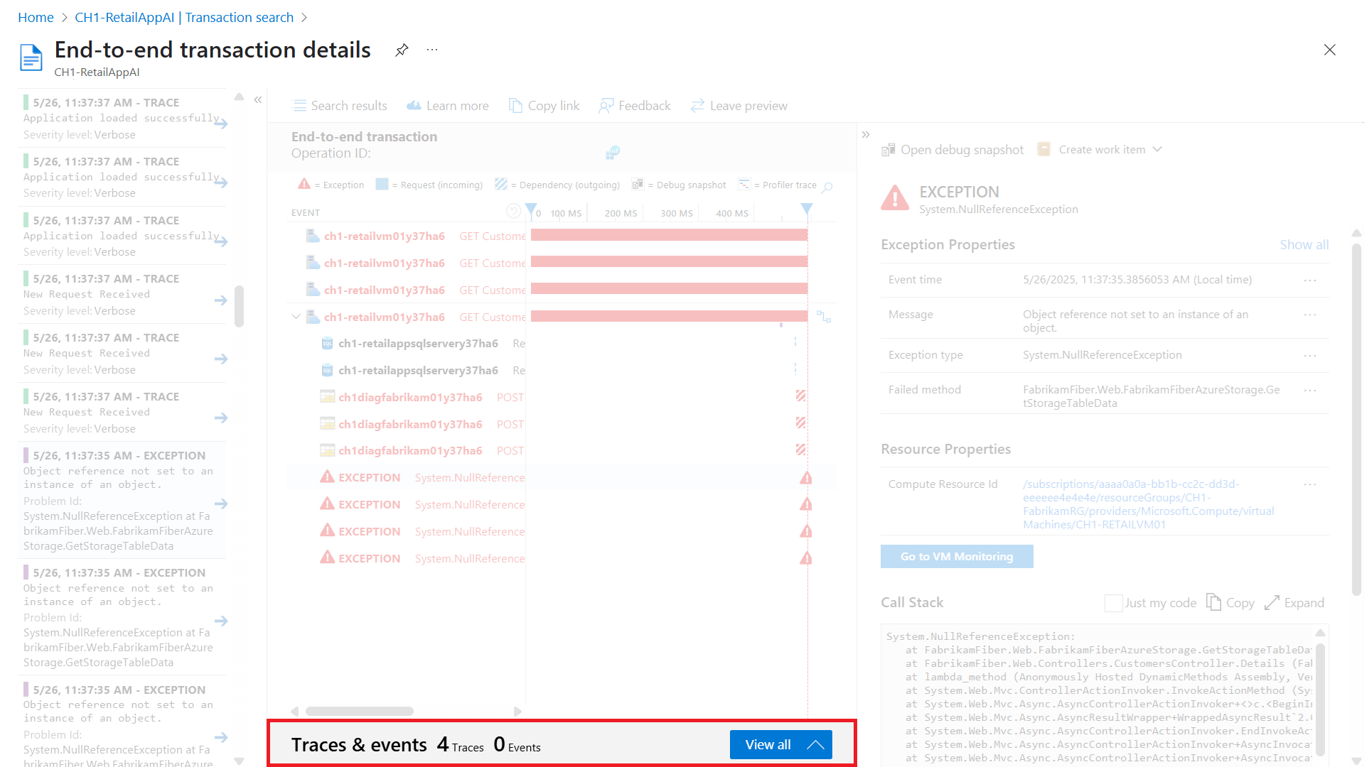 The Transaction diagnostics experience, also called End-to-end transaction details view, shows a Gantt chart of the transaction, which lists all events with their duration and response code.