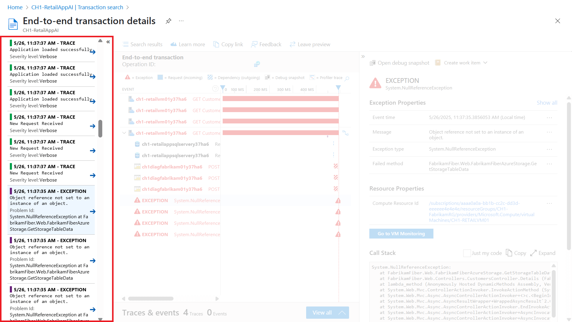 To investigate the root cause of an error or exception, you can drill into the problematic operation for a detailed end-to-end transaction details view that includes dependencies and exception details.