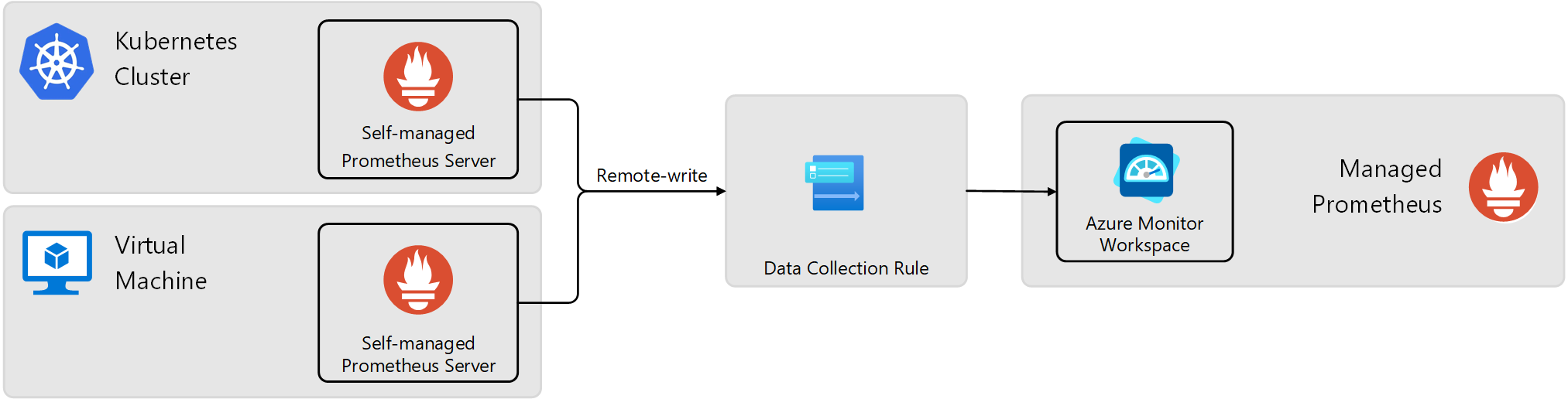 Remote_write is a feature in Prometheus that allows you to send metrics from a local Prometheus instance to remote storage or to another Prometheus instance. Use this feature to send metrics from self-managed Prometheus running in your Kubernetes cluster or virtual machines to an Azure Monitor workspace used by Managed Prometheus.