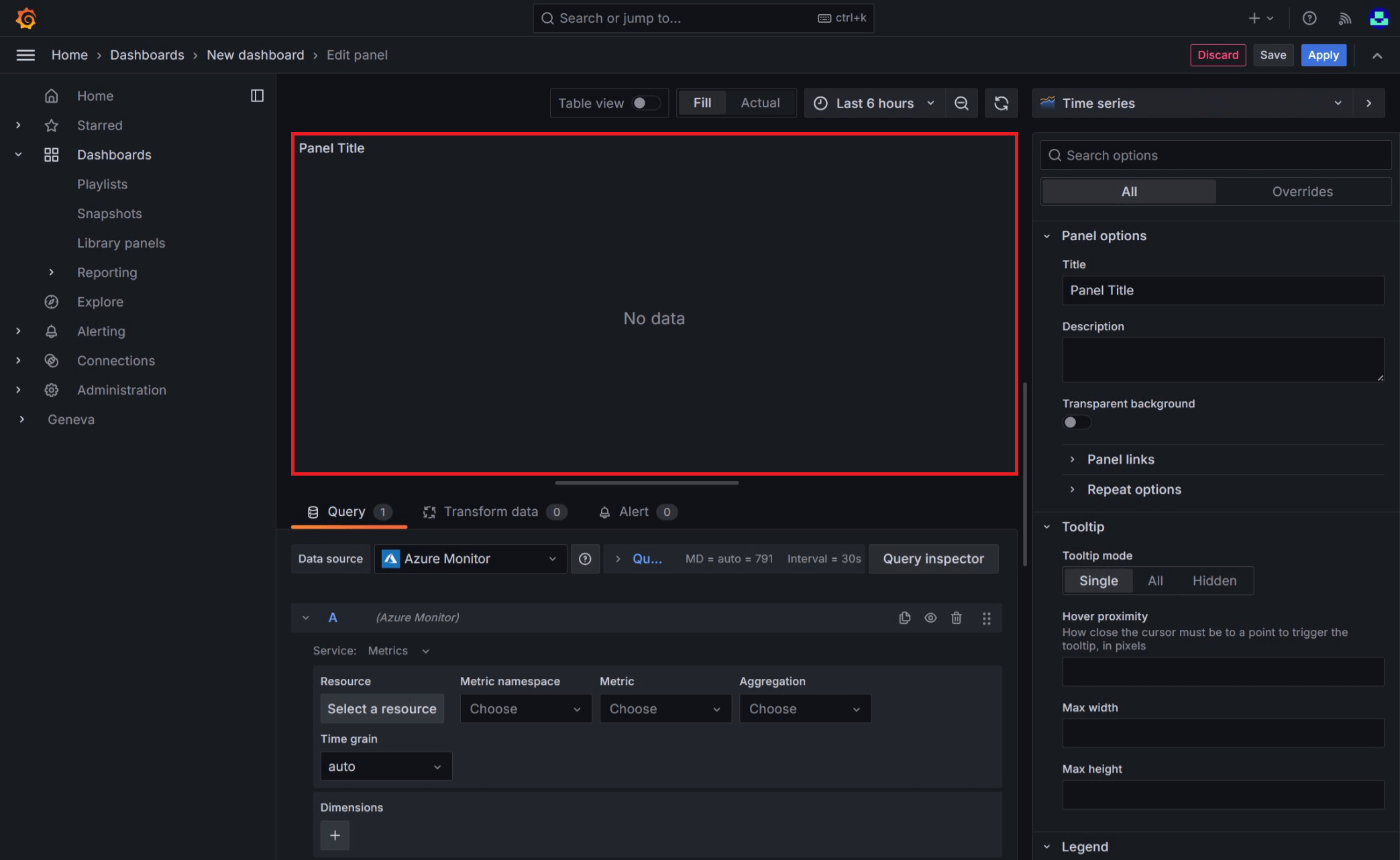 In the new dashboard, select Add visualization and choose the Azure Monitor data source. You can try other charting options, but this article uses Time series as an example.