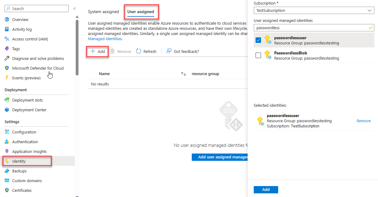 Complete the following steps in the Azure portal to associate the user-assigned managed identity with your app. These same steps apply to the following Azure services: