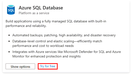 1. Select the Try for free link on the Azure SQL hub at aka.ms/azuresqlhub.