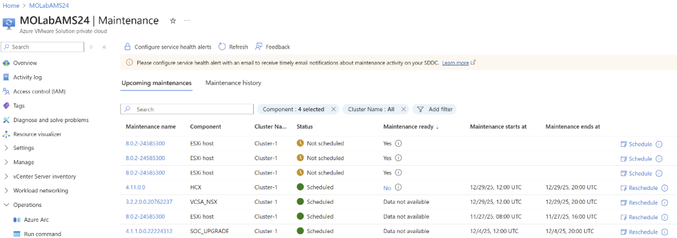 This feature is enabled only for specific maintenance activities. As a result, not all Azure VMware Solution maintenance tasks appear in this section or have the option to reschedule.
