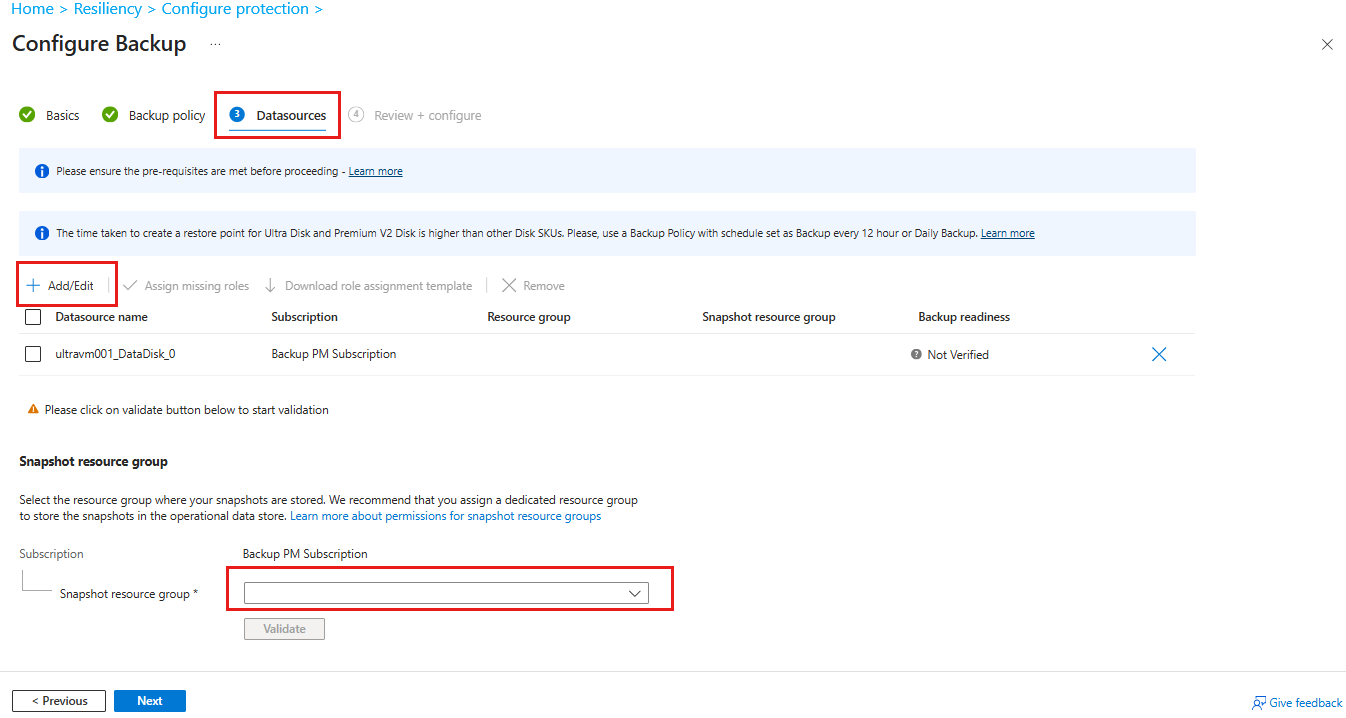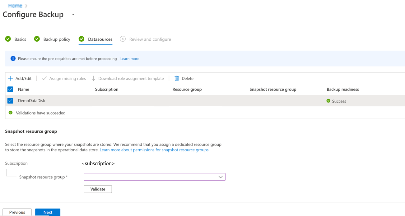 Select Snapshot resource group and then select Validate to initiate prerequisites checks.