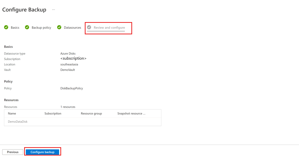 On the Review and configure tab, select Configure backup to complete the backup configuration of selected disks.