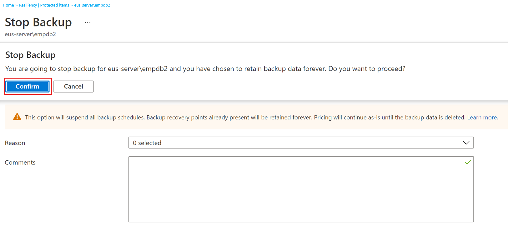 Stop backup and retain data forever: This option helps you stop all future backup jobs for your Azure Database for PostgreSQL server. However, the Azure Backup service retains the backed-up recovery points forever. You need to pay to keep the recovery points in the vault. (For details, see Azure Backup pricing.) You can restore from these recovery points, if needed. To resume backup jobs, use the Resume backup option.