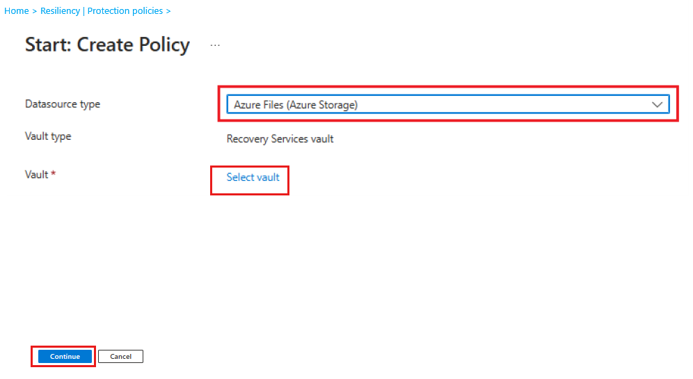 On the Start: Create Policy pane, select the Datasource type as Azure Files (Azure Storage). In the Select vault link, you can select a Recovery Services vault, and then select Continue.