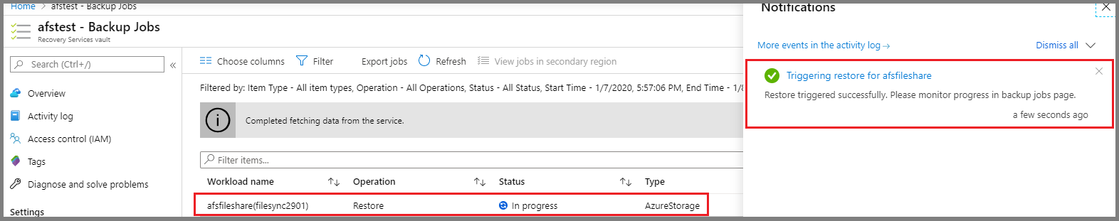 After you trigger the restore operation, the backup service creates a job for tracking. Azure Backup displays notifications about the job in the portal. To view operations for the job, select the notifications hyperlink.