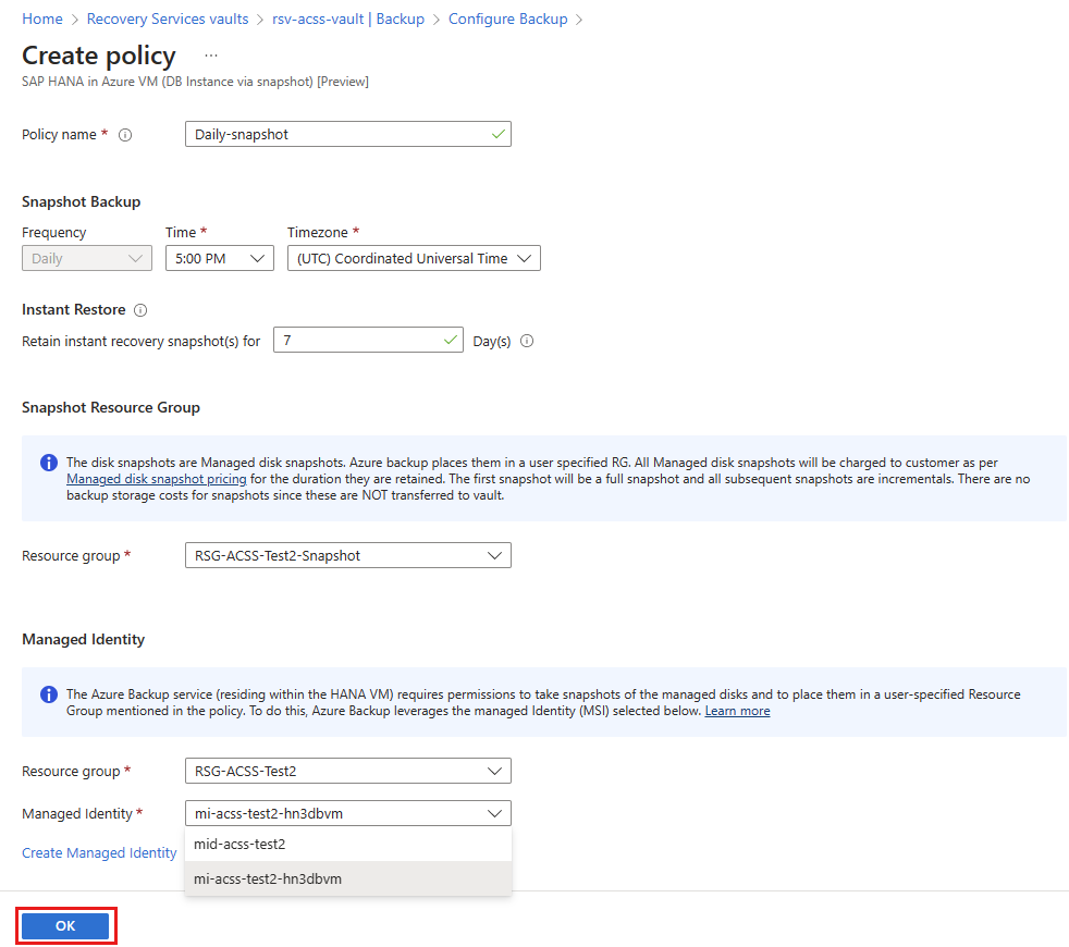 Managed Identity: Select a managed identity in the dropdown list to assign permissions for taking snapshots of the managed disks and place them in the resource group that you've selected in the policy.