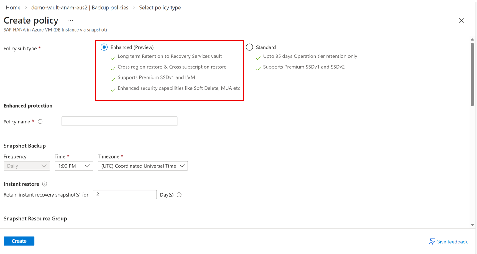 - You can now store the Snapshot backups in a Recovery Services vault by using Enhanced backup policy (preview) for HANA Snapshot backup. This provides all the vault level features, such as Immutability, Soft-delete, cross-region restore, and more, for SAP HANA snapshot backups. This policy also ensures faster restores from instant tier.