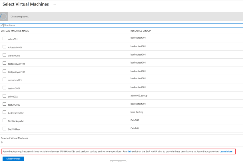 On the Select Virtual Machines pane, at the bottom, select the this link in Run this script on the SAP HANA VMs to provide these permissions to Azure Backup service.