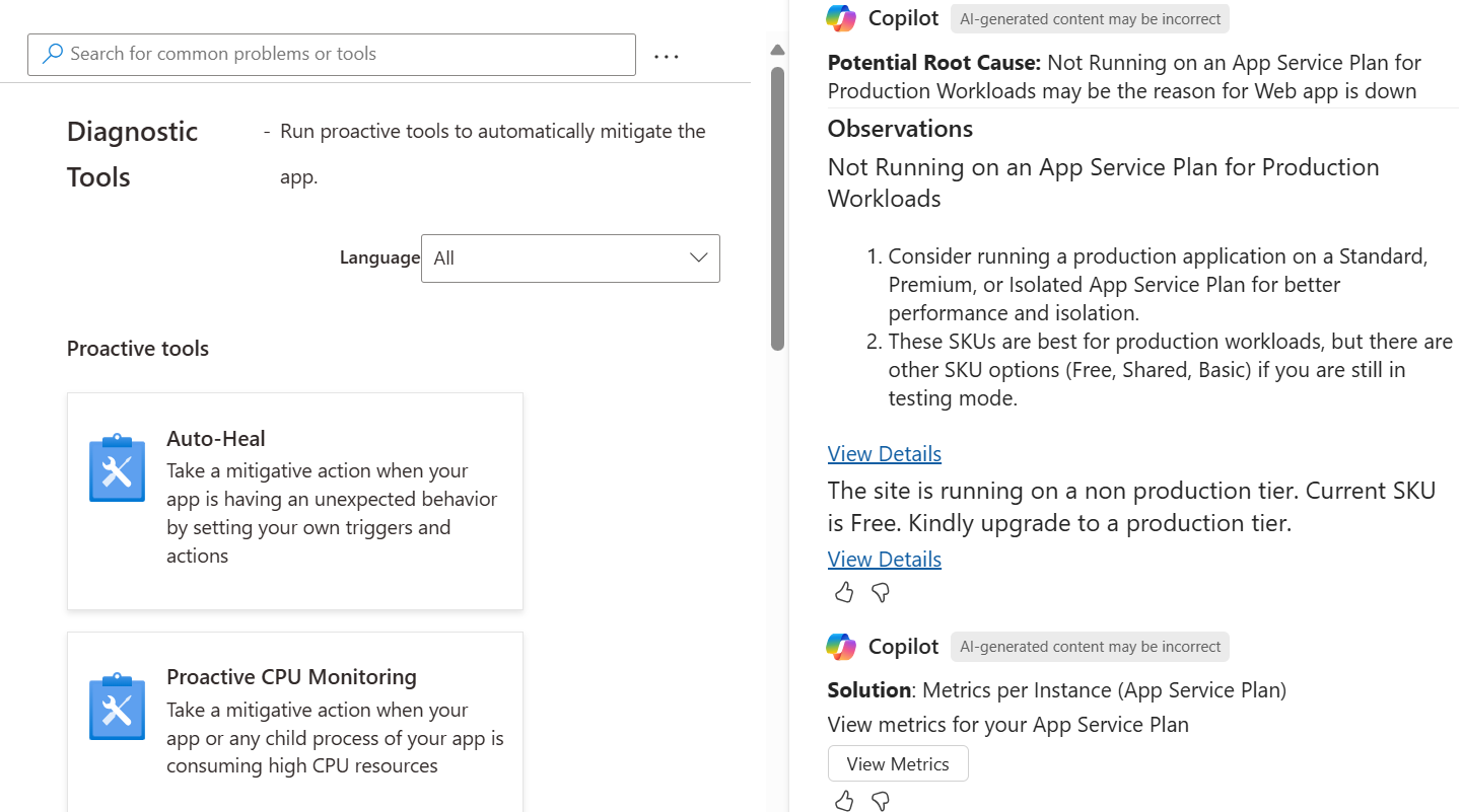 You can tell Azure Copilot "my web app is down." After you select the resource that you want to troubleshoot, Azure Copilot runs diagnostic checks to identify the cause of the problem.