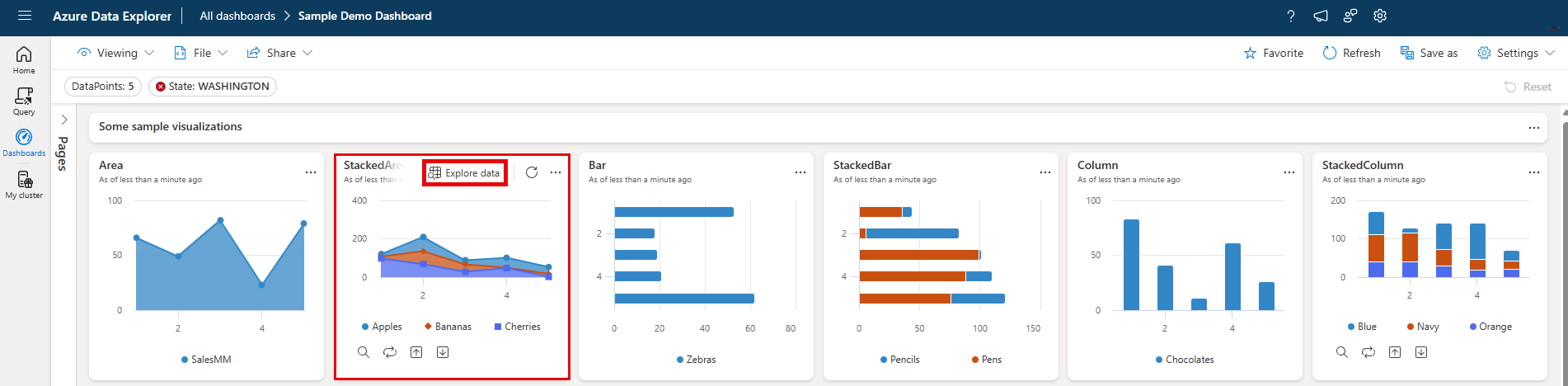 Even if a dashboard is shared with you and you only have viewer permissions, you can still explore it. The exploration process begins with viewing the data and its corresponding visualization as they appear on the tile. From there, you can further explore the data by adding or removing filters and aggregations, and viewing your results using different visualizations, all without needing any knowledge of the Kusto Query Language.
