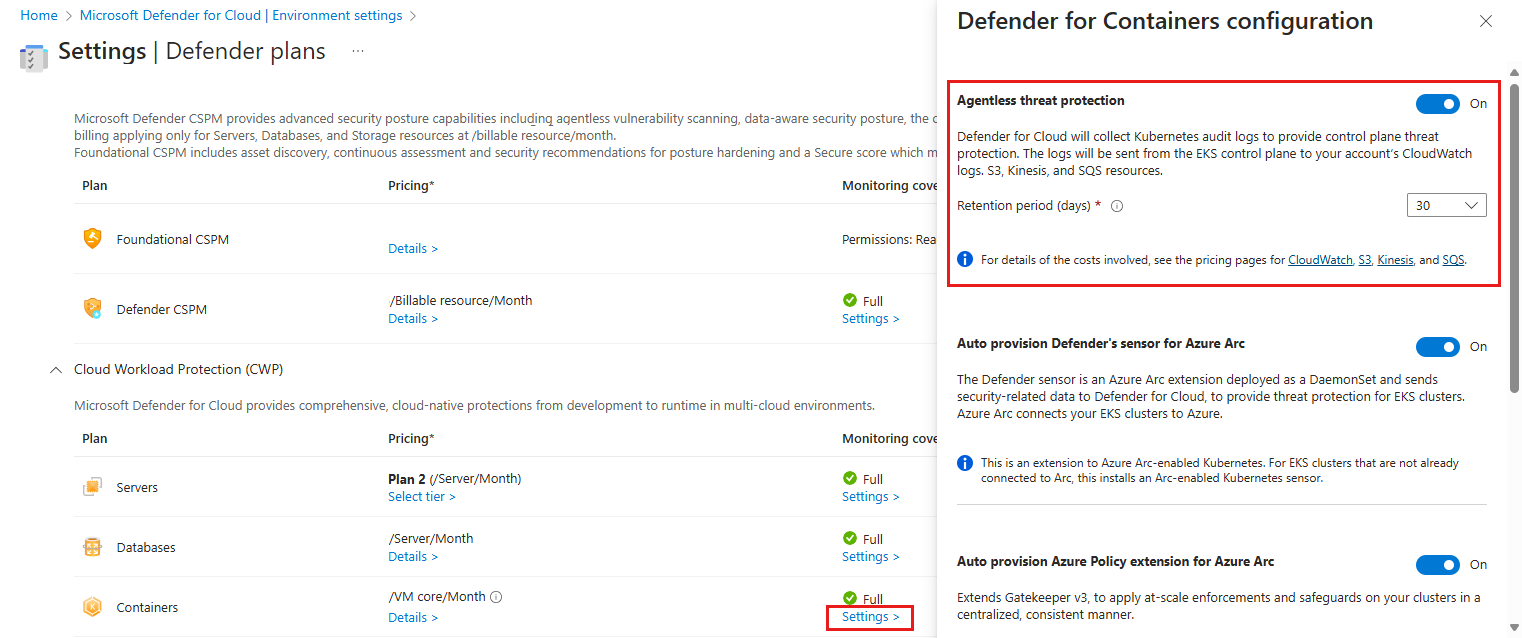 Agentless threat protection: Provides runtime protection to your cluster containers by sending Kubernetes audit logs to Microsoft Defender.